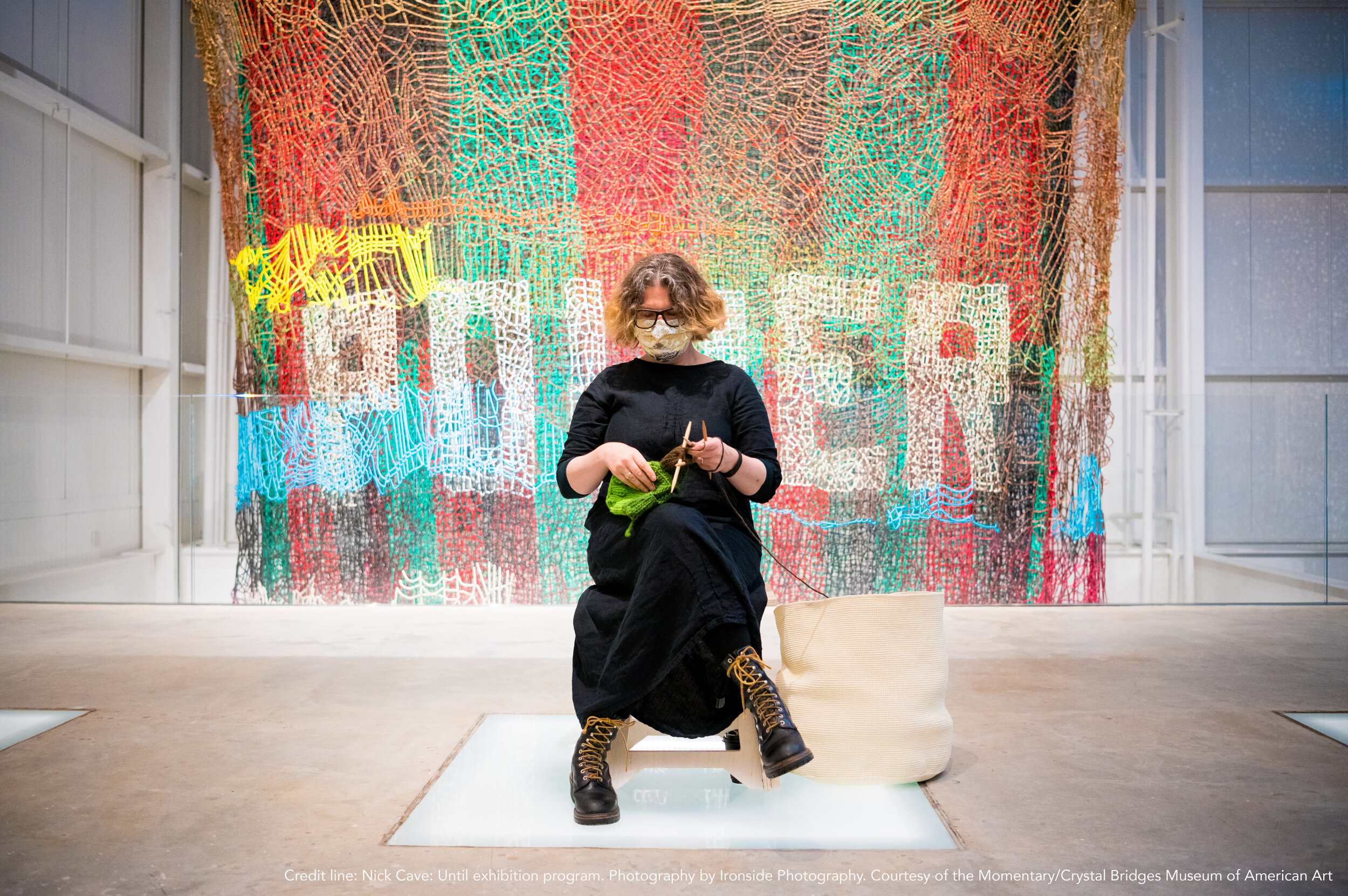 This special edition of #littlesweaterhug was made on site at The Momentary at the invitation of Nick Cave and in response to the question that inspired Cave’s Until: “Is there racism in heaven?” Each sweater in this edition is handknit in response to onsite conversations led by visitors to the exhibition. The hanger and the tags are part of the work and include a poem by Ronna Lebo, commissioned for the edition. Proceeds from the sale of each sweater launched the Open Mouth poet-in-residence program at Mt. Sequoyah’s Creative Spaces in Northwest Arkansas. The tag for each sweater included the text below and the poem Reckoning & Reconciliation by Ronna Lebo:
